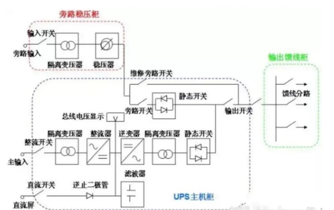 二、不間斷電源結構 完整的UPS不間斷電源系統一般由ups主機、旁路穩壓柜、輸出饋線柜三大部分組成。細分起來,這三大部分可以分為主路、旁路、整流器、蓄電池、靜態開關、隔離變壓穩壓器、電源輸入電路、逆變器等組。 1、主路:確保ups不間斷電源的正常工作就需要一個功能齊全的控制電路,來承擔控制ups各部分的工作,主路承擔這些責任。 2、旁路:ups不間斷電源在進行從交流市電旁路供電到由逆變器供電或從逆變器供電到市電旁路供電的切換的情況下,是由旁路以及旁路開關來實現的。 3、整流器:整流器主要有兩個功能,一是將交流電(AC)變成直流電(DC),經濾波后供給逆變器;二是給蓄電池提供充電電壓,起到一個充電器的作用。其基本工作是穩壓,采用可控硅或高頻開關整流器,本身具有可根據外電的變化來控制輸出幅度的功能,當外電發生變化時,輸出幅度基本不變的整流電壓。 4、蓄電池:ups作為儲存電能的裝置,其在市電失斷電時,可以將直流電逆變后,為負載提供不間斷電源。ups不間斷電源容量大小決定了其維持放電(供電)的時間,容量越大供電時間越長。 5、靜態開關:靜態開關又稱靜止開關,它是一種無觸點開關,是用兩個可控硅(SCR)反向并聯組成的一種交流開關,其閉合和斷開是由邏輯控制器控制的。 6、隔離變壓穩壓器:其作用是在輸入或輸出部分將交流與直流隔離,穩壓器除了隔離之外還有穩定電壓的作用。具有異常時自動轉市電或切斷輸出、保護過后自動恢復的優點等。 7、電源輸入電路:儲能電池主要負責系統的凈化功能,由于整流器對瞬時脈沖干擾不能消除,整流后的電壓仍存在干擾脈沖。 8、逆變器:主要負責頻率的穩定工作,頻率穩定度取決于變換器的振蕩頻率的穩定程度。逆變器能夠將整流器或蓄電池輸送來的直流電,在調配信號的控制下,轉換為穩頻、穩壓、無干擾的交流電,通過變壓器和輸出濾波器向負載輸送電量。