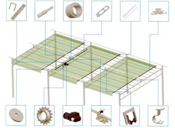 二、遮陽(yáng)系統(tǒng) 遮陽(yáng)系統(tǒng)主要包括外部遮陽(yáng)系統(tǒng)和內(nèi)部遮陽(yáng)系統(tǒng),主要用于驅(qū)動(dòng)遮陽(yáng)網(wǎng)的開(kāi)啟和關(guān)閉,冬季陽(yáng)光缺乏時(shí)開(kāi)啟使陽(yáng)光多入,夏季時(shí)關(guān)閉或關(guān)小阻擋多余的陽(yáng)光。 1、外部遮陽(yáng)系統(tǒng):溫室大棚頂部安裝外遮陽(yáng)骨架,覆蓋黑色遮陽(yáng)網(wǎng)由電機(jī)帶動(dòng)齒輪傳動(dòng)鏈接推拉桿實(shí)現(xiàn)自動(dòng)操作,遮陽(yáng)率大概在75%左右。 2、內(nèi)部遮陽(yáng)系統(tǒng):內(nèi)遮陽(yáng)的遮陽(yáng)幕布一般是白色的,傳動(dòng)裝置和外遮陽(yáng)無(wú)差,屬于鋁箔遮陽(yáng)網(wǎng),能夠有效防止溫室內(nèi)部溫度散失。