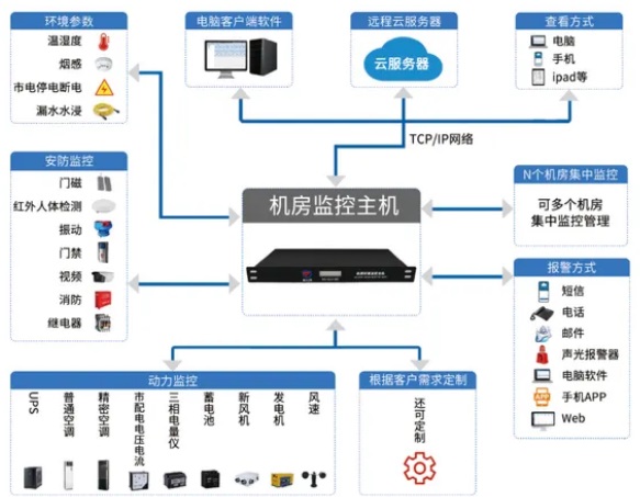 動環監控系統24小時守護機房、數據中心、智能樓宇、交通局、電信基站等重要地方,功能完善且優越,其核心功能包括以下幾方面。 1、統一采集:對市電、供配電、ups電源、發電機、溫濕度、紅外、門禁、煙霧、漏水等設備以及環境進行采集,并將所有參數輸送到主機,用于后續進行數據處理。 2、信息分析:對采集到的數據進行匯總、分析,分析的方式是依據用戶事先設置的正常范圍數值的上限、下限來判斷。 3、信息儲存:將所有數據進行分類儲存,儲存的時限不等。 4、設備管理:能增加、刪除、修改、查找所監控的動環設備,根據實際清潔進行監控參數、設備的調整。 5、圖形接口:提供將其它3D工具創建的模具進行整理導入接口。 6、權限管理:提供用戶、角色與權限管理的功能。 7、數據接口:提供將其它系統或格式的數據導入或對接的接口。 8、環境展示:提供機房所在院區、機房外觀與內部結構的3D展示功能。 9、資產展示:提供資產設備的3D展示功能,包括配置信息展示,準確定位資產位置信息,自動盤點資產數量,實時監測設備的異動情況。 10、管線展示:提供鏈路的3D展示功能,包括鏈路以及端口信息,高管線管理水平和故障解決效率。 11、容量展示:提供U位、能耗、載重等數據可視化功能。 12、告警展示:可以將所有設備異動情況,第三方平臺告警信息集中展示,提供統一預計機制。 13、任務管理:包括盤點任務、上架任務、下架任務、停機任務以及維修任務。 動環監控系統極大的方便了機房管理,使機房等重要場所更安全、更高效、更便捷的運行,實現企事業規范化、智能化、自動化管理。