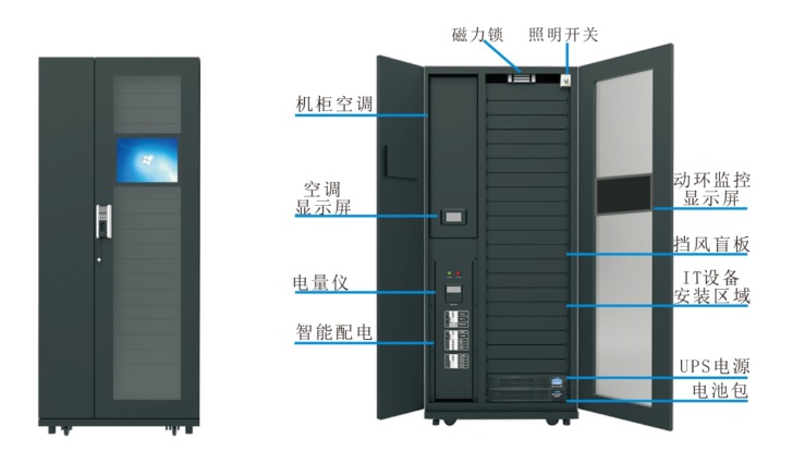 二、智能一體化機(jī)柜的特點(diǎn) (1)高效節(jié)能:高效供電,近端制冷,冷熱密閉隔離,消除局部熱點(diǎn),PUE將至1.5以下。 (2)環(huán)境要求不高:無(wú)需特意裝修,地板等專(zhuān)業(yè)機(jī)房的配套工程,可在各種環(huán)境下實(shí)現(xiàn)部署使用。 (3)靈活擴(kuò)容:可實(shí)現(xiàn)后期自定義式的無(wú)縫擴(kuò)展。 (4)一體化:深度集成機(jī)柜、配電、UPS、電池、空調(diào)、監(jiān)控及現(xiàn)場(chǎng)管理系統(tǒng)等。 (5)制冷匹配靈活:根據(jù)不同應(yīng)用場(chǎng)景需要,自適應(yīng)3.5KW、6.5KW或12.5KW機(jī)架式精密空調(diào),匹配負(fù)載熱量。 (6)簡(jiǎn)化運(yùn)維:安裝超大屏,可視化圖像界面操作。可通過(guò)網(wǎng)絡(luò)進(jìn)行遠(yuǎn)程監(jiān)控、界面簡(jiǎn)單、非專(zhuān)業(yè)人員可以輕松操作。 (7)模塊化:配電模塊+UPS模塊+電池模塊+空調(diào)模塊等,可按需擴(kuò)容。 (8)應(yīng)急無(wú)憂(yōu):專(zhuān)利循環(huán)風(fēng)道設(shè)計(jì),支持內(nèi)外循環(huán)間切換,智能溫控、保障有效。 (9)交互式語(yǔ)音控制:故障時(shí)可語(yǔ)音撥號(hào)告警;被叫時(shí),管理員可遠(yuǎn)程修改參數(shù)閾值,或增減管理員。 (10)多樣告警:聲光、微信、app、短信、電話(huà)、e-mail等多種告警。 (11)快速部署:組建預(yù)裝,進(jìn)場(chǎng)即用,不需要裝修、地板等配套工程、無(wú)需安裝空調(diào)室外機(jī);僅需一條市電進(jìn)線(xiàn)即可隨時(shí)使用。