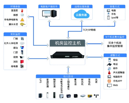 動環監控系統是保護機房必不可少的系統,動環監控系統的使用下實現了集中管理模式,使管理水平大幅度提高,同時在節省人力物力資源方面提供了極大的貢獻。 “集中管理”就是把各機房現場的設備和環境系統等將數據傳輸到本地監控主機,監控主機通過數據網絡將數據傳輸到總部監控管理中心,監控中心管理服務器實現對分布在不同區域的網絡監控機房的集中管理。 一、集中管理模式的特點 1、集中監控、管理動力、環境、消防、安保、網絡等。 2、集中顯示一個機房多個設備或多機房多設備的運行狀態。 3、打破空間局限,無需親臨現場就能實時了解、查看、管理機房信息。 4、實現多個網絡機房、多種類設備、多環境變量的統一管理。 5、集中管理模式相對成本低。