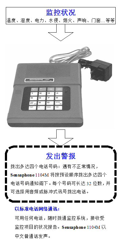 遇有不正常的狀況,Sensaphone 1104M系統實時撥出多達四個電話號碼,以英語/普通話通知您,您亦可遙距監聽現場聲音