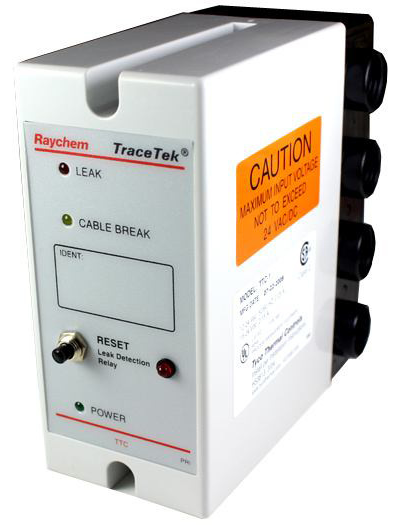 TraceTek的TTC-1模塊是一套成本低廉的液體泄漏檢測設備。本模塊在設計上既可與任何TraceTek傳感電纜配套使用,并可與各種監(jiān)控系統(tǒng)整合。TTC-1模塊包括三套繼電器觸點,可用以進行遠程報警以及設備控制。遠程報警裝置備選。 它可以用于許多監(jiān)控系統(tǒng)。包括繼電器觸點,可用于遠處監(jiān)測和設備控制。它尺寸小,可以安在墻內(nèi)或墻上。“泄漏”繼電可以現(xiàn)場調(diào)節(jié),成為時間延時繼電器。延時時間可以設備,到感應線干燥時自動復位,或用手動按RESET(復位)鍵來實現(xiàn)。可以在現(xiàn)場進行敏感度調(diào)整。TTC控制器可接30米長線纜,供電為12-24V AC或15-24V DC。 TTC-1 模塊提供相互獨立的泄漏報警與故障報警繼電器。泄漏繼電器具有兩套觸點,因此可用于發(fā)出報警和對本地裝置提供直接控制連接。不過,本系統(tǒng)不適合經(jīng)常性地切換使用用途。電纜中斷報警功能負責對傳感電纜與跨接電纜的完整性進行監(jiān)控,如果電纜失去連續(xù)完整性即會啟動報警。故障繼電器為常態(tài)通電模式,因此對斷電情況也會發(fā)出報警信號。TTC 模塊應安裝在室內(nèi)非危險地點。由于本模塊體積小,因此便于安裝在墻內(nèi)、墻上或 DIN 1 導軌系統(tǒng)上。 參數(shù): 傳感電纜兼容性 : 所有 TraceTek 傳感電纜 每條通道傳感電纜最大長度 : 100 英尺 (30 米 ) 溫度額定值 : 32°F 至 122°F (0°C 至 50°C) 塑料外殼 : 0.77 磅 (0.35 公斤 ) 電源要求 (不包括變壓器) : 12V 至 24V 交流 ; 50/60 Hz 250 mA 或15V 至 24V 直流50 mA 端子板布線 : 14 AWG (美國線規(guī)) ( 最大 2.5 mm2) TraceTek 跨接電纜布線 : 18 AWG (美國線規(guī)) (1 mm2) 繼電器 : 泄漏 :1 DPDT, Cm 型 , 30 V 直流 或 250 V 交流 , 5 A 額定值