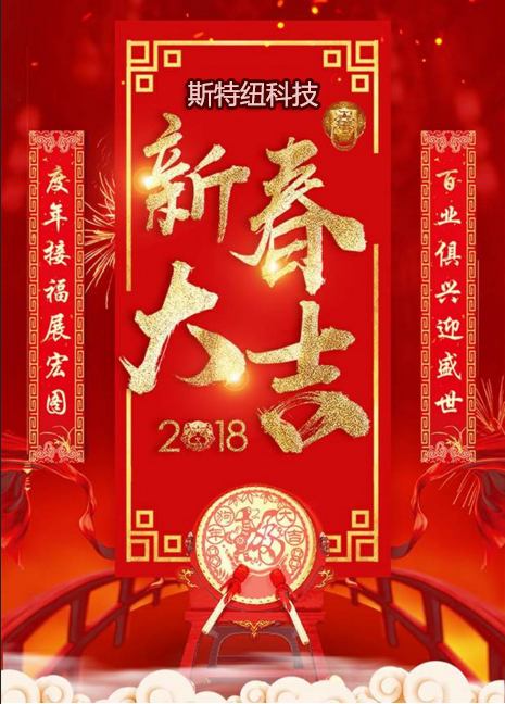隨著2018年春節臨近,年味越來越重了,時時響起的鞭炮聲,和人來人往的集市都能感受到,春節就要來了。我們跟隨國家假日規定從2月12日-2月23日放假,24號正式上班,給大家帶來不便請諒解! 我們不懈努力,并根據多年來與客戶不斷深入溝通,銷售團隊與技術支持團隊不斷在實踐一線實地勘察,斯特紐已積累了十分豐富的行業經驗。從售前溝通到方案制定,從按時發貨到實地安裝,從技術指導到售后回訪,斯特紐一步一個腳印,用高品質的產品、扎實的服務,贏得客戶的信任與好評。 在未來,斯特紐將以飽滿的熱情、澎湃的激情,奮力前進、奔向未來。繼續用產品實力、技術實力、服務實力回饋廣大客戶朋友,回饋社會。 在此新春佳節來臨之際,斯特紐全體員工恭祝大家闔家歡樂,新春大吉!
