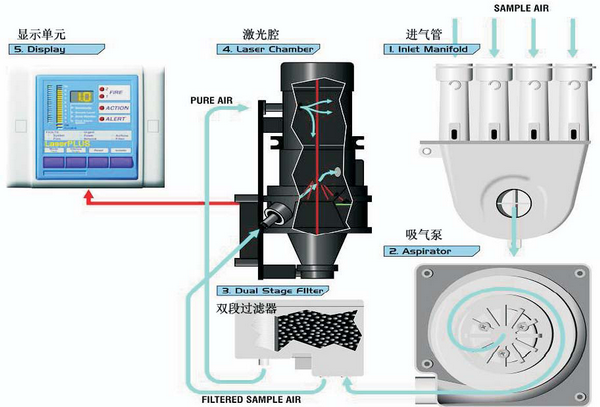 VESDA早期煙霧探測器是利用高效率的抽氣機,配合網(wǎng)狀抽氣管道,主動地、連續(xù)地從保護區(qū)域內(nèi)抽取空氣樣品,這些樣品經(jīng)高效過濾器濾掉懸浮的灰塵和塵埃顆粒后,進入探頭內(nèi)的精密采樣室,空氣樣品一旦進入采樣室就受到高強度寬光譜光源的照射。很小一部分的入射光受到空氣樣品中懸浮顆粒的散射而進入高靈敏度固態(tài)接收器。接收器產(chǎn)生一個表示空氣樣品污染(煙)濃度的信號。