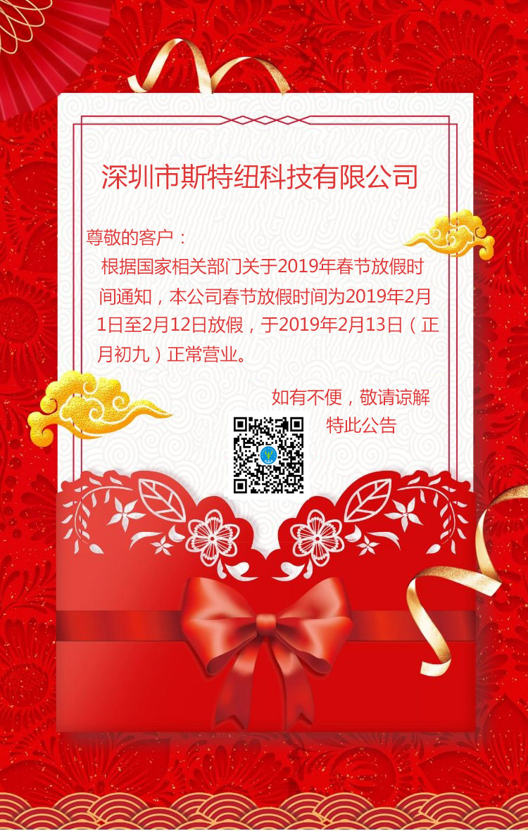 又是一年新到來!我們迎來了充滿希望、機(jī)遇和挑戰(zhàn)的2019年! 在此,感謝大在家在過去多年來對(duì)我們斯特紐的支持與信任。同時(shí)也希望在新的一年里,斯特紐能繼續(xù)得到大家的關(guān)注及認(rèn)可,并且我們斯特紐也會(huì)一如既往全心全意的為大家提供優(yōu)質(zhì)的機(jī)房監(jiān)控方案及服務(wù)! 正值中國(guó)的傳統(tǒng)節(jié)日“春節(jié)”來臨,在此向各位新老客戶和廣大朋友拜個(gè)早年!預(yù)祝大家春節(jié)快樂!財(cái)源廣進(jìn)!事業(yè)紅火! 為了讓公司員工過個(gè)歡快祥和的春節(jié),斯特紐根據(jù)國(guó)家規(guī)定,現(xiàn)將公司春節(jié)放假時(shí)間通知如下: 2月1日至2月12日放假,于2月13日(正月初九)正常營(yíng)業(yè) 由于放假給大家?guī)淼牟槐悖凑?qǐng)諒解!如有機(jī)房監(jiān)控需求可以撥打我們官網(wǎng)上銷售手機(jī)號(hào),我們同樣為你獻(xiàn)上完美的機(jī)房解決方案,再次感謝大家一直以來對(duì)斯特紐的關(guān)注及支持! 衷心祝愿大家度過一個(gè)歡樂、祥和的春節(jié)! 斯特紐