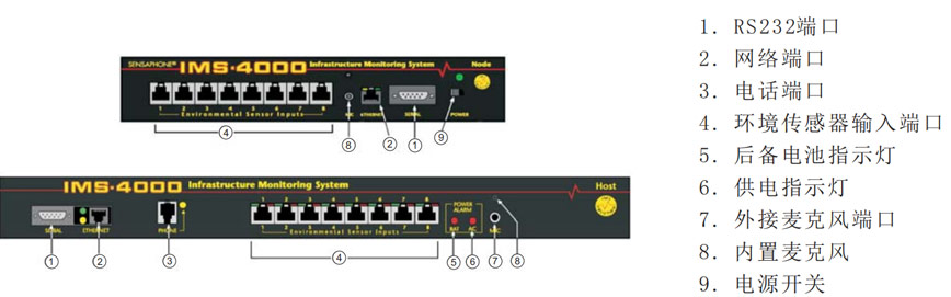主要功能: 1.電源監控:IMS-4000 本身內置電源傳感器,可監控察市電電壓; 2.聲音監控:內置噪音傳感器,可監控機房有否過高噪音(包括機器不正常的運行聲音); 3.溫度監控:溫度傳感監控機房溫度值及變化,也可局部的監控,如機框、服務器機箱內的監控等; 4.濕度監控:濕度傳感監控機房濕度值及變化; 5.漏水監控:監控空調、供水系統、天花板、門、窗等的漏水; 6.干接點類監控:干接點監控所包含類型相當的廣泛,可以接到 UPS、空調及發電機等電機的故障輸出端口,以監控 UPS、空調及發電機等的工作狀態,也可以作門禁使用,監控是否有非法闖入; 7.紅外線傳感器:紅外線傳感器可以起安防使用,監控是否有非法闖入(破門、窗等),也可以監控機房內的明火、暗火等所有發熱的物件; 8.網絡設備監控:每臺 IMS-4000 主機及副機各可監控 64 個網絡設備,包括 LAN 服務器,網站服務器、郵件服務器、FTP 服務器、路由器、打印機服務器等等。 IMS-4000主要特點如下: 1.內置網頁服務器