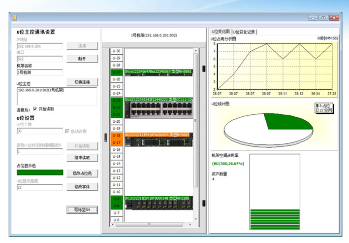U位資產管理系統它是一項突破性創新技術,在繼承了RFID標簽優點的同時,完全解決了RFID技術在機房U位資產監控場應用景中的四大缺陷,具有高可靠性、高準確性、精準定位、免維護的特點。 U位資產管理系統,采用最新精密技術的高頻芯片設計方案,采用RFID無線定位識別技術,可以自動實時監控機架空間狀況,自動實時監控機架上設備的型號、設備占用的U位數、設備在機架的具體位置、設備的物理安全狀況、設備生命周期狀況,自動盤點在架資產的實時狀況等功能。具有高效準確、功耗低、外形美觀安裝方便等特點。以RS485 方式傳輸可與各種監控系統相整合,實現遠程控制。 U位資產管理系統的價值所在呢? 1.資產實時定位 2.位置變更記錄 3.機柜空間監控 4.生命周期監控 5.資產殘值統計 6.報警(重量、溫度等) 每個設備上架后,U管家模塊會自動監控整個機架內設備的總功耗,如果達到預警功耗上限,模塊會發出預警聲音和報警事件,如果超出功耗上限,模塊會處于功率超載報警狀態,并發出連續報警。