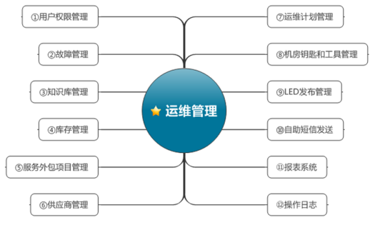 數據中心運維管理系統所涵蓋的范圍很廣,包括用戶權限管理、故障管理、知識庫管理、庫存管理、服務外包項目管理、供應商管理、運維計劃管理、機房鑰匙喝工具管理、LED發布管理、自助短信發送及報表系統和操作日志等等。