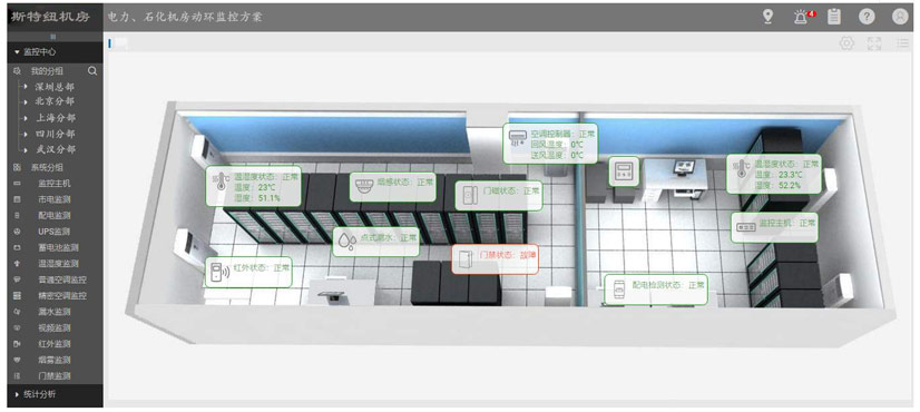 該系統可以對分布在各個獨立的動力設備和機房環境、機房安保等對象進行遙測、遙信、遙控、遙調和遙視等五遙,實時檢測環境、監控系統和設備、安保的運行狀態,記錄和處理相關數據,及時偵測故障,并作必要的聲光報警,適時通知人員處理;實現機房的少人、無人值守,以及電源、空調的集中監控維護管理,提高供電系統的可靠性和通信設備的安全性,為機房的管理自動化、運行智能化和決策科學化提供有力的技術支持。 我們斯特紐的成功案例遍布政府、電力、通信、教育、石化、石油、金融、證券、航空、鐵路、海關、企業等行業,專為計算機網絡機房、通信機房、通信基站、電力基站、變電站、鐵路機房、高速公路供配電站、供電局、UPS機房、無人值守現場、倉庫等場景的機房動環監控提供高性價比解決方案。