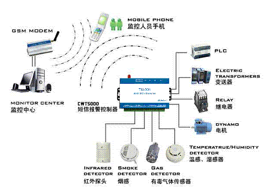 2)TU-901短信報警主機-本地串口型 TU-901短信報警器為企業用戶提供易于上手、功能豐富的設備報警與控制解決方案,讓您的手機變成了被監控設備的遙控器。設備一旦發生異常,系統就會及時給您的手機發出短信進行報警,您也可以隨時發短信指令查詢設備當前狀態或者遙控設備,比如啟動設備,或者停止設備等。